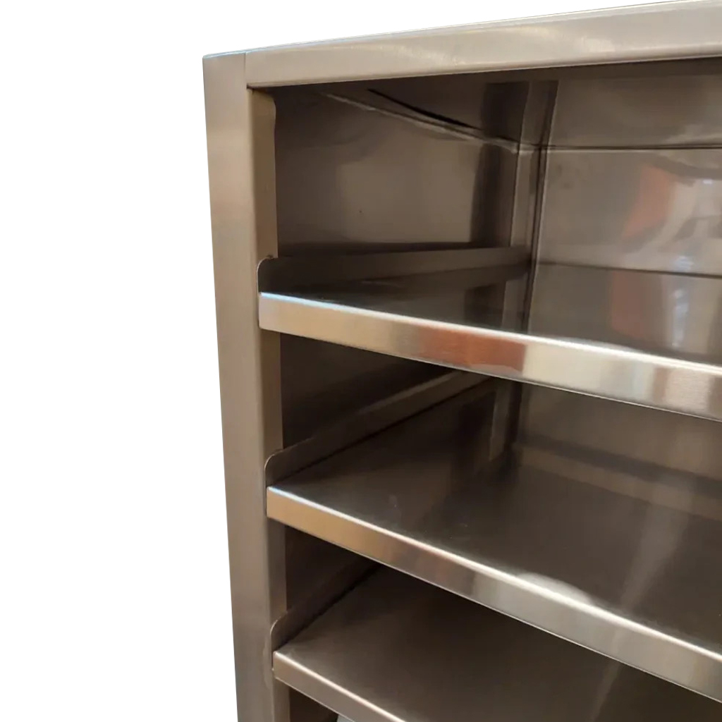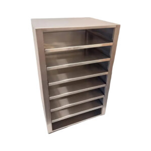 | PBR002 | Aço Inox SAE 304 | Dimensões C600xL500xA1000 mm | 7 divisórias de 520×120 mm de altura entre elas. |
