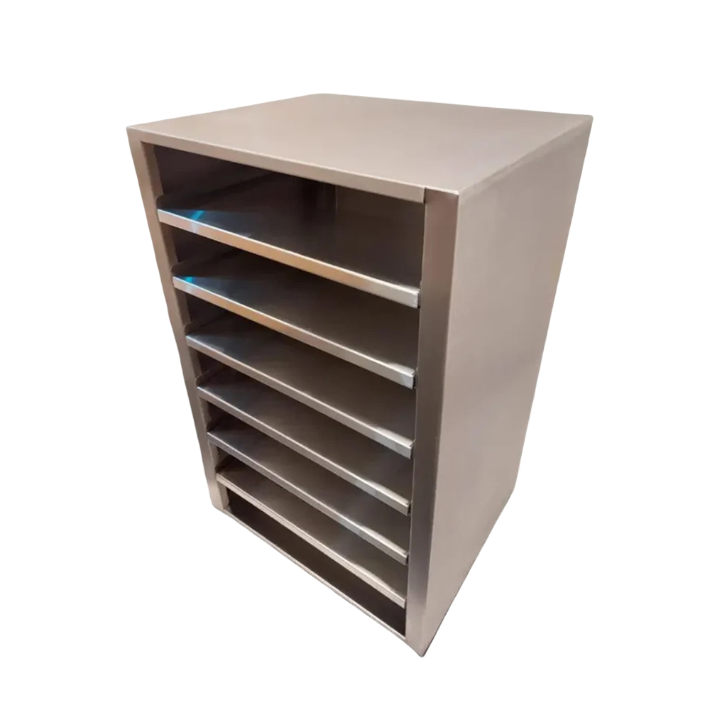 | PBR001 | Aço Inox SAE 430 | Dimensões C600xL500xA1000 mm | 7 divisórias de 520×120 mm de altura entre elas. |