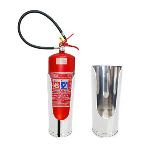 Porta extintor PE01 para extintores de Pó Químico de 4 kg e 6 kg, produzido em aço inox polido resistente contra a oxidação e a ação do tempo.