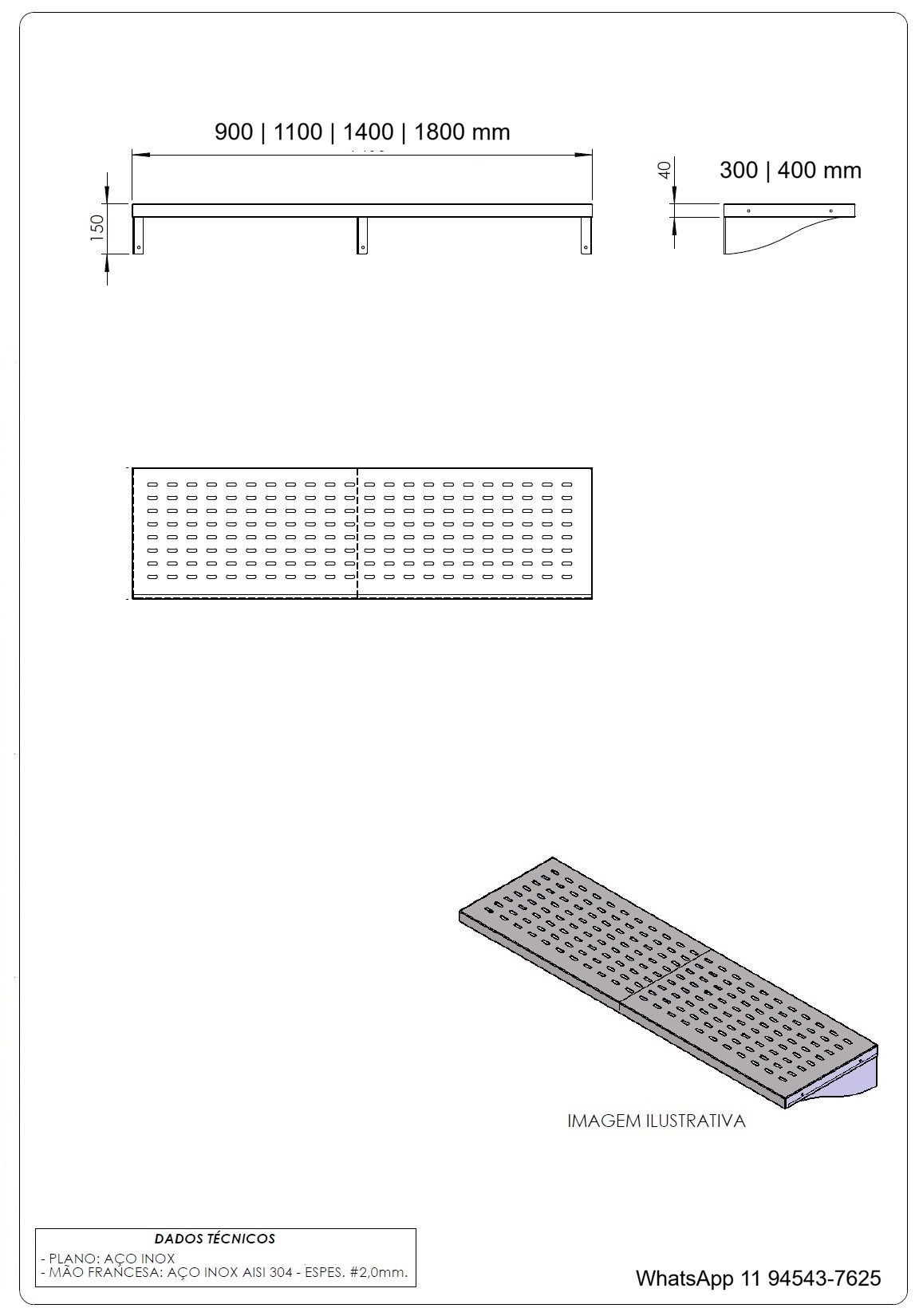 Prateleira elevada perfurada para fixar em paredes, fabricada em chapa aço inox com a superfície perfurada para escoamento de água. Fixação por mão francesa através de parafusos e buchas.