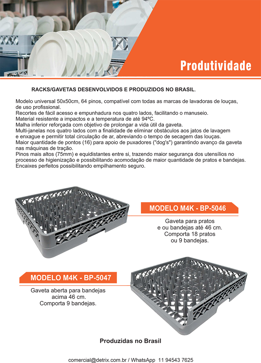 Compatível com todos modelos de lavadoras de louças industrial (Hobart, Netter, MVF, Ebone, Fagor, Rayman, Fiamma, Etc.). Capacidade para 16 pratos ou 8 pratos com Ø acima de 290 mm ou 8 bandejas de até 460 mm.