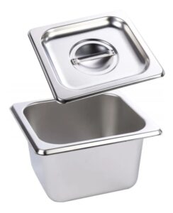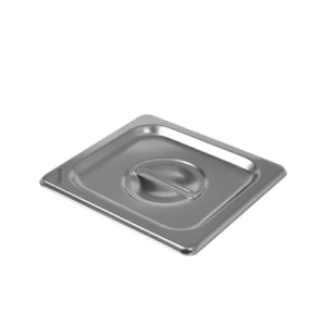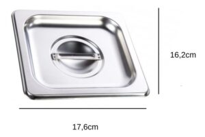 Tampa para cuba gastronômica GN 1/6 de aço inox com dimensões mundialmente padronizadas para proteger e conservar alimentos em cubas GN durante o preparo, refrigeração e cocção em fornos combinados, utilizada como tampa para cuba gastronômica em buffet, rechaud, banho maria e condimentadora de cozinhas, restaurantes e refeitórios em geral.
