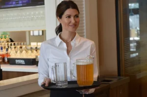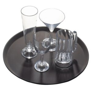 Esta bandeja de garçom Cambro redonda acomoda copos de drinks, taças de vinho e garrafas de bebidas em geral e em restaurantes um prato de refeição, talheres, um prato de salada ou sobremesa, uma lata ou copo de refrigerante ou suco, ou então até dois lanches grandes, dois acompanhamentos (batata frita, por exemplo) e duas latas ou copos de refrigerante ou suco.