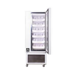 Ultracongelador de canecas, congela canecas em 20 minutos a -30ºC com economia de energia. Fabricado em aço inox interno e externo em chapa de aço galvanizado kroma nas cores branca ou black. Isolação térmica em poliuretano espessura 60 mm, guias internas para 6 bandejas de 40×60 cm com canecas e fluxo interno de ar forçado com controle de temperatura digital evitando formação de micro cristais de gelo.
