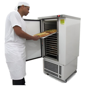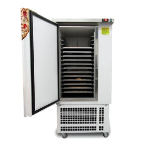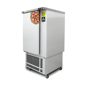Ultracongelador de pizza e resfriador rápido de pizza, congela 30 discos de pizzas em 20 minutos com 2 ciclos de trabalho. Resfriamento rápido que diminui a temperatura de +90°C a +3°C e congelamento rápido que diminui a temperatura de +90°C a -18°C.