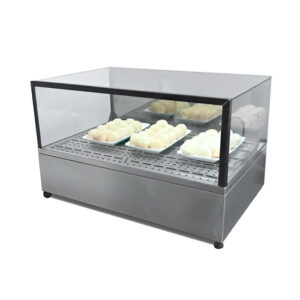 Vitrine expositora aquecida para pão de queijo, salgadinhos e pizzas, fabricada em aço inox com a tecnologia Air Flow, fluxo de ar aquecido que circula de forma homogênea em todas as superfícies dos alimentos.